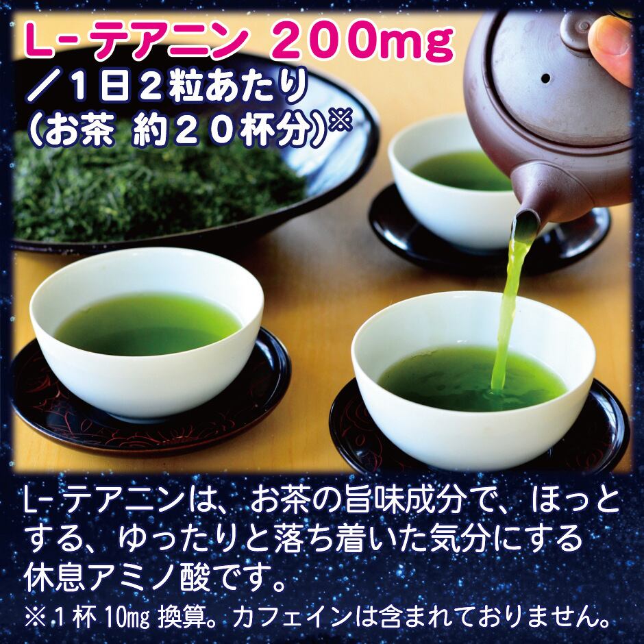 主要成分含有量:L-テアニン 200mg/1日2粒あたり(1袋総量6000mg)