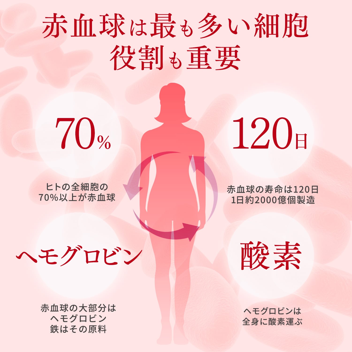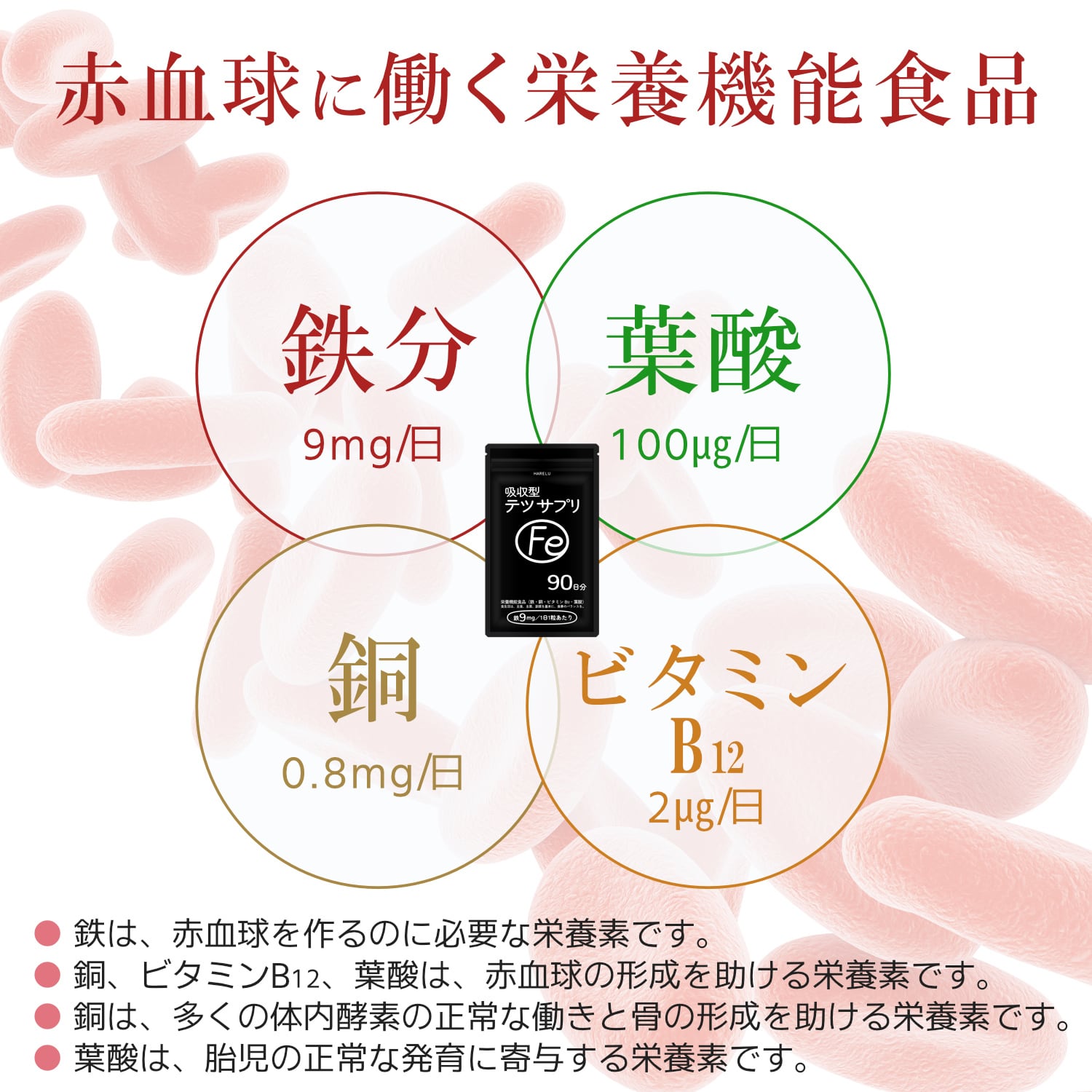 ◆赤血球の生成に役立つ4つ(鉄・銅・ビタミンB12・葉酸)の栄養機能食品。